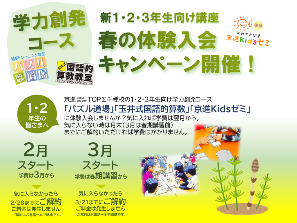 ホーム 校舎を探す 千種校 イベント&ニュース一覧 京進の低学年向けコース、新年度キャンペーン!