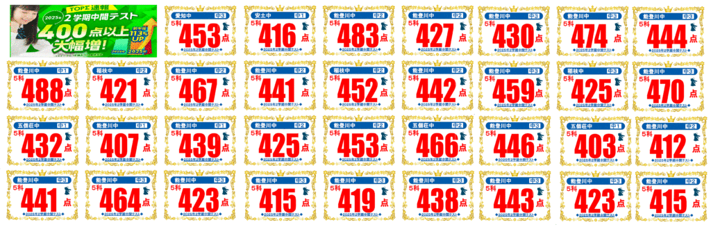 能登川校の中学生コースは、モノグサ(ICTアプリ)や小テストでのフォローを活用しテスト対策学習に取り組んでもらっています。この取り組みにより、通塾生の定期テストの平均点が前年度より約30点アップしています!今も、次の期末テストに向けてがんばっています。