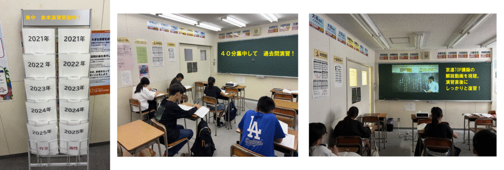 能登川校の県中対策講座は、毎週土曜日に赤本演習を実施しています。塾で一斉にスタートして問題を解くので、本番同様の緊張した雰囲気の中で問題演習に取り組んでもらえます。県中対策受講生は、無料参加のイベントとして企画しています!京進能登川校は、がんばる受験生を応援します!