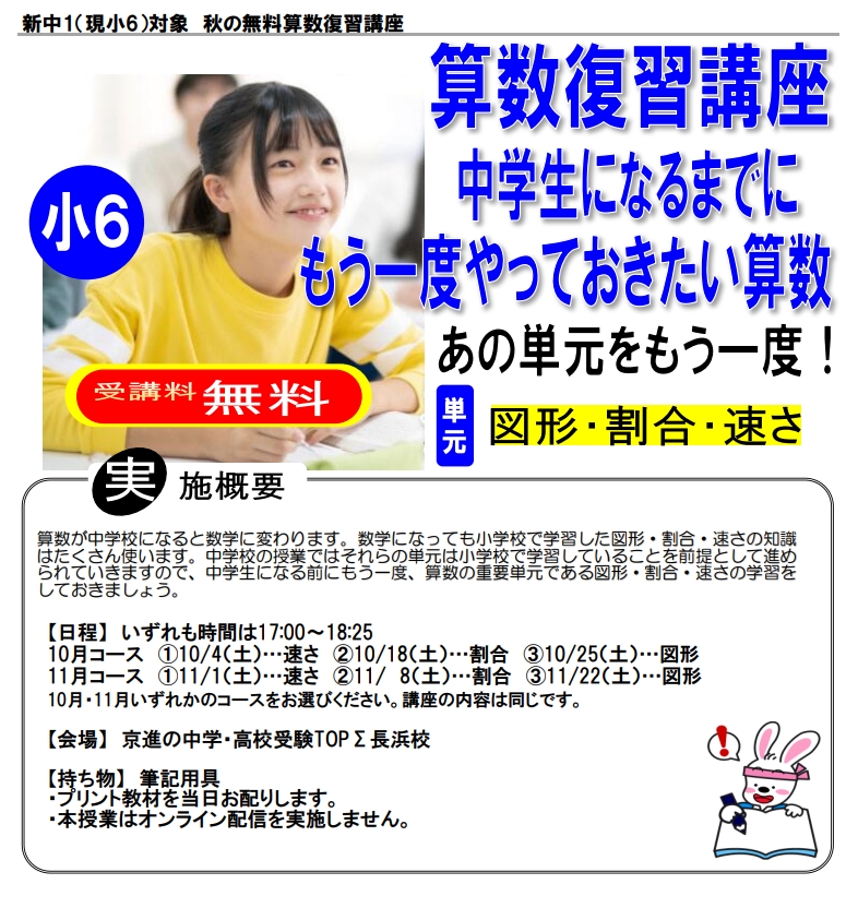 京進TOPΣ長浜校で算数復習講座を無料で実施いたします。