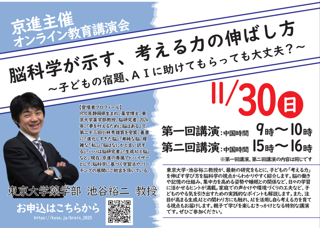 東京大学・池谷裕二教授が、最新の研究をもとに、子どもの「考える力」を伸ばす学び方を脳科学の視点からわかりやすく紹介します。脳の働きや記憶の仕組み、集中力を高める姿勢や睡眠との関係など、日々の学習に活かせるヒントが満載。家庭での声かけや環境づくりの工夫など、子どものやる気を引き出すための実践的なポイントも解説します。また、注目が高まる生成AIとの関わり方にも触れ、AIを活用し自ら考える力を育てる視点もお届けします。親子で学びを楽しむきっかけとなる特別な講演です。ぜひご参加ください。