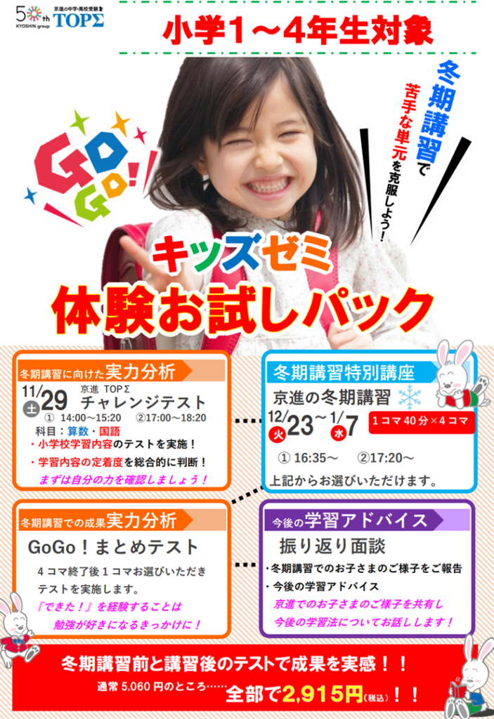 【科目】算数・国語【コマ数】各80分×2コマ×4日間【内容】中学入学前に理解しておきたい小学校の重要単元の学習※詳しい時間割やご料金をご準備いたします。 無料の資料請求は下記よりお問い合わせください。