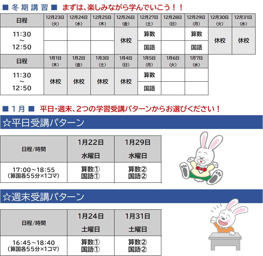 算数は計算・図形の基礎、国語は読解の入り口を中心に、短期間で基礎力を固めます。