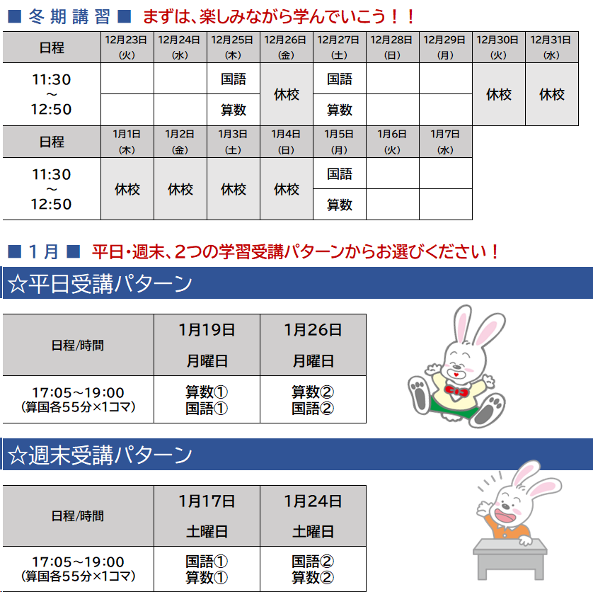 算数は計算・図形の基礎、国語は読解の入り口を中心に、短期間で基礎力を固めます。