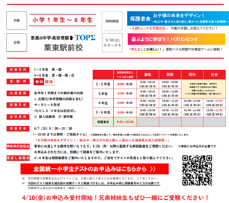 この全国規模のテストを、京進の中学・高校受験TOPΣ栗東駅前校 で受験できます!