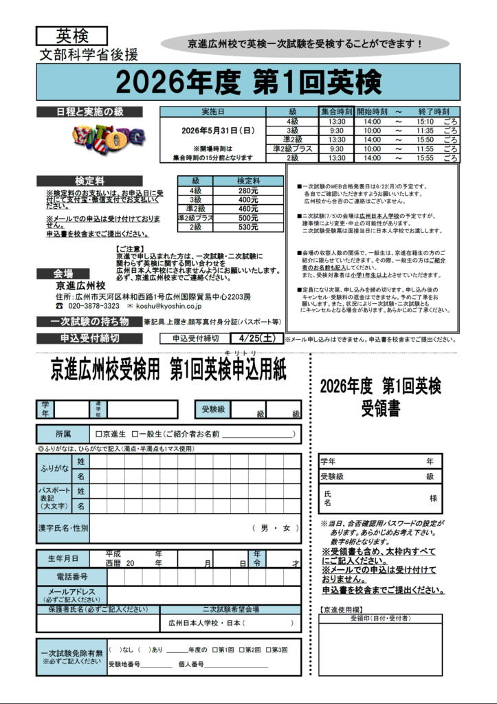 2026年度第1回の英語検定【5月31日(日)実施】のお申し込みが開始となりました。皆様のお申し込みをお待ちいたしております。
