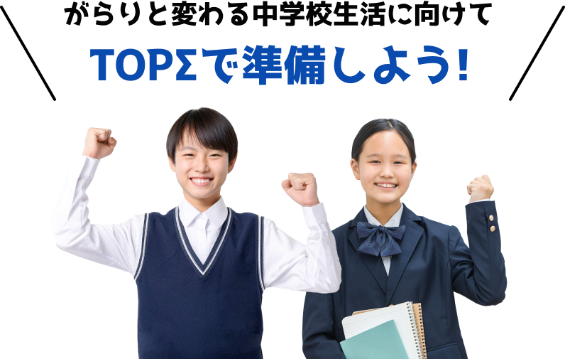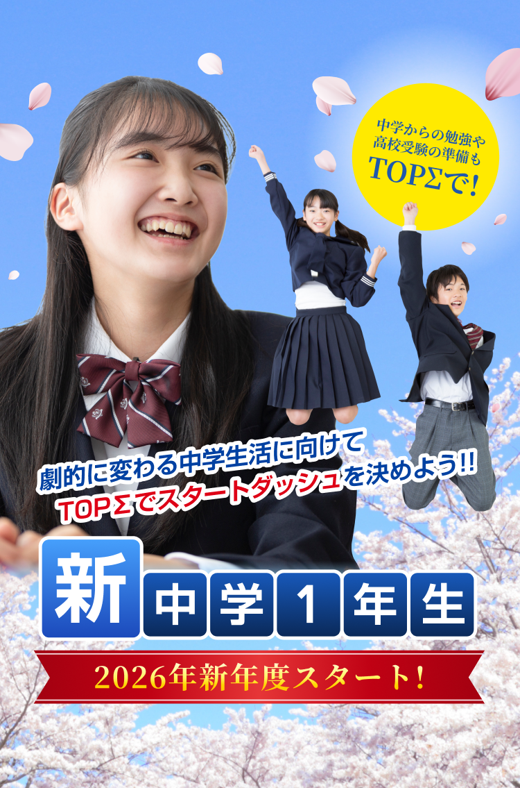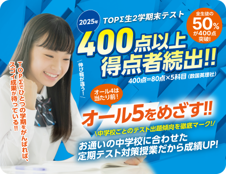 TOPΣは長年のノウハウをもとに、お通いの中学校の定期テストを徹底リサーチ!バツグンの成果にこだわります。TOPΣでちょっとよくわからない、かつ丁寧に指導します。めざせオール5!TOPΣで一緒にがんばろう!
