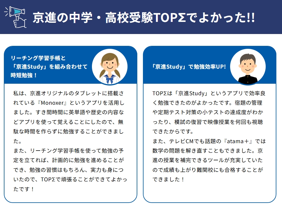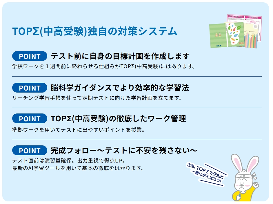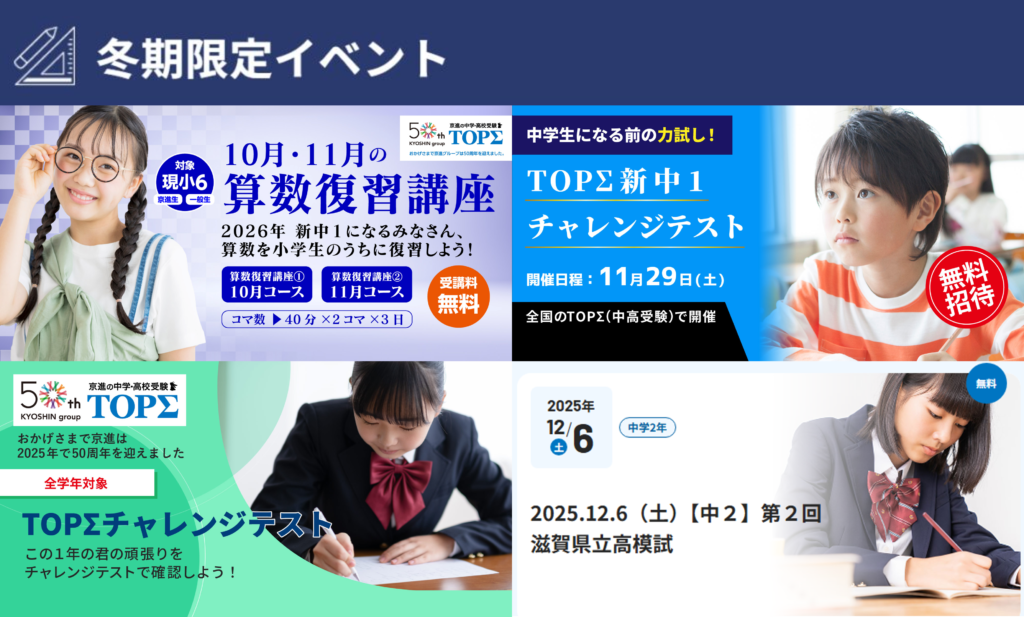 TOP∑彦根校のHPをご覧いただきありがとうございます。『京進の中学・高校受験TOPΣ彦根校』では、生徒のみなさんひとりひとりの夢実現に向けて、職員全員でサポートさせていただきます。第一志望校合格を目指して一緒に頑張りましょう!