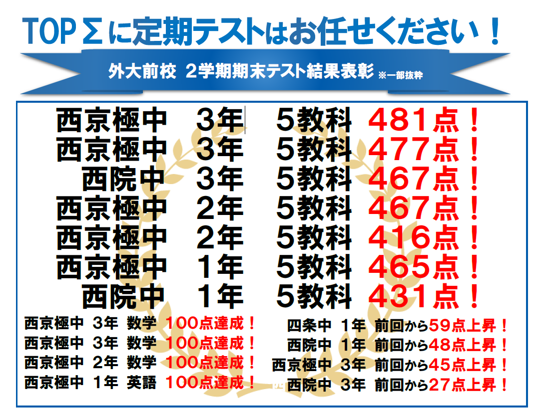 京進の中学・高校受験TOPΣは集合塾ですが、「ひとりひとりを大切に」をモットーにすべてのお子様に個別に具体的な学習方法を提案し、サポートいたします。定期テスト対策は地元密着の京進TOPΣにお任せください!