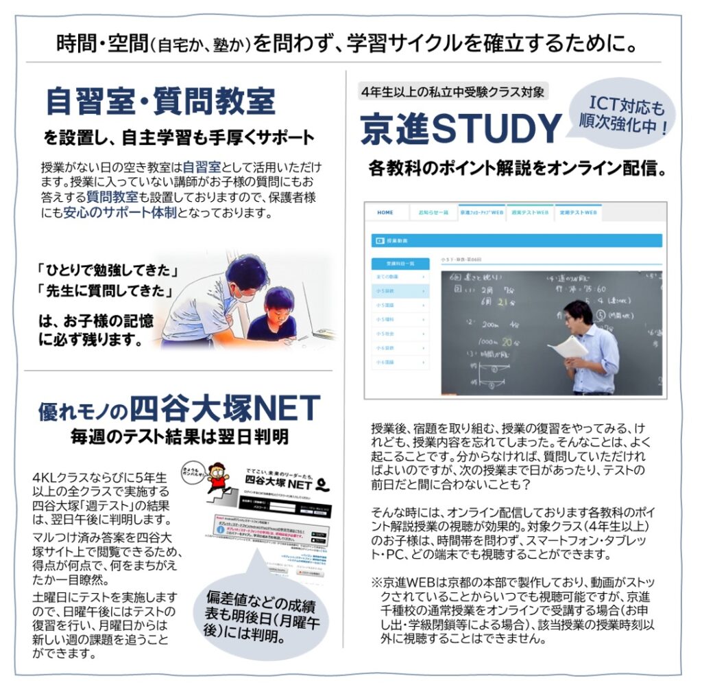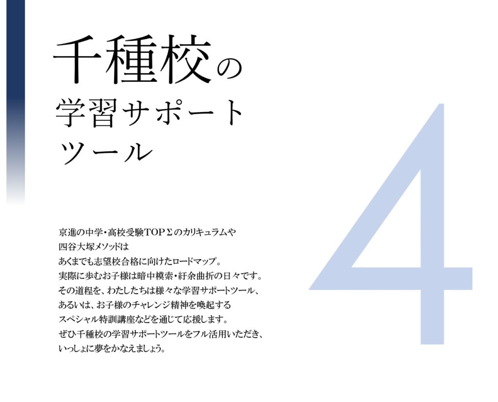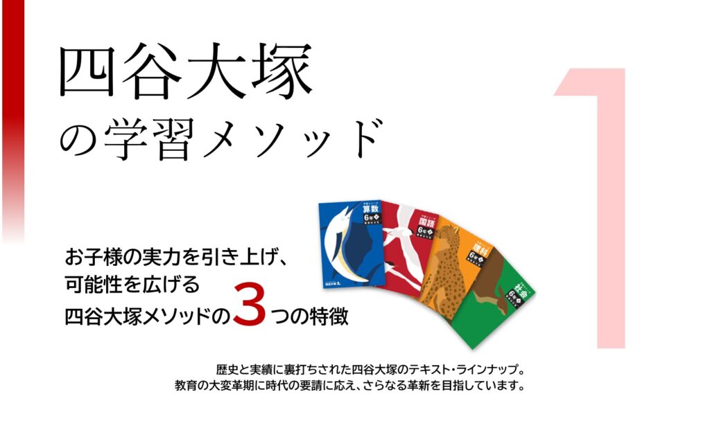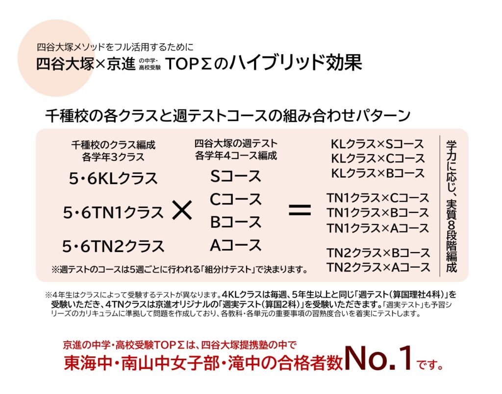 京進の中学・高校受験TOPΣは関東地方の大手中学受験塾、四谷大塚と提携しております。使用する教材は、全学年・全クラス四谷大塚が発刊する「予習シリーズ」。現在、首都圏の受験生の2人に1人が使用するベストセラーであり、中学受験最高の教科書とも評されています。(四谷大塚教材PDFパンフレットより引用)