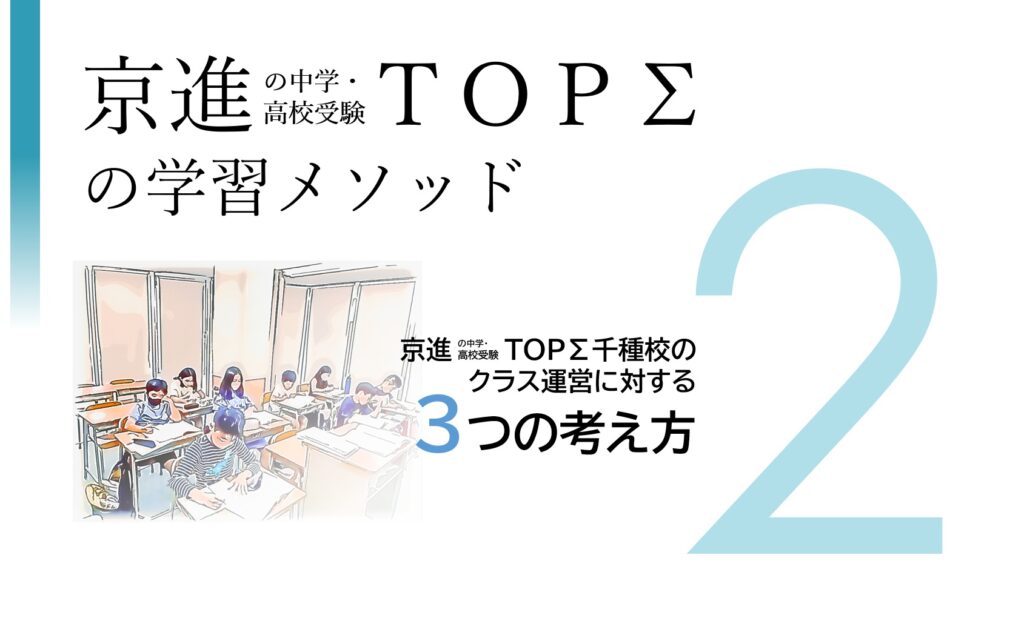 受験に「偏差値」や「順位」はつきもの。しかし、京進の中学・高校受験TOP∑ではリーチング授業に代表されるように、他者との比較ではなく、自分の目標に基づいてスケジュールを考え、勉強方法を考えることを指導の基本としています。仲間やライバルとの切磋琢磨は大切ですが、通常授業では成績順の座席指定などは行わず、クラスの仲間全員で第一志望校合格を勝ち取ることを最終目標としています。