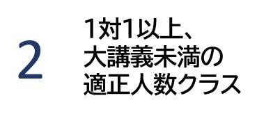 大講義だと、話についていけない、置いてけぼりになってしまう、1対1だと先生が自分に合わせてくれるけど、ライバルとの競争やクラス全体のペースに自分が合わせるという習慣が作れない。京進は、そんな問題に対応すべく、適正人数制による小~中規模クラス編成とすることで、ひとりひとりのお子様に十分に目が届き、きめ細かく指導できる体制を整備しています。