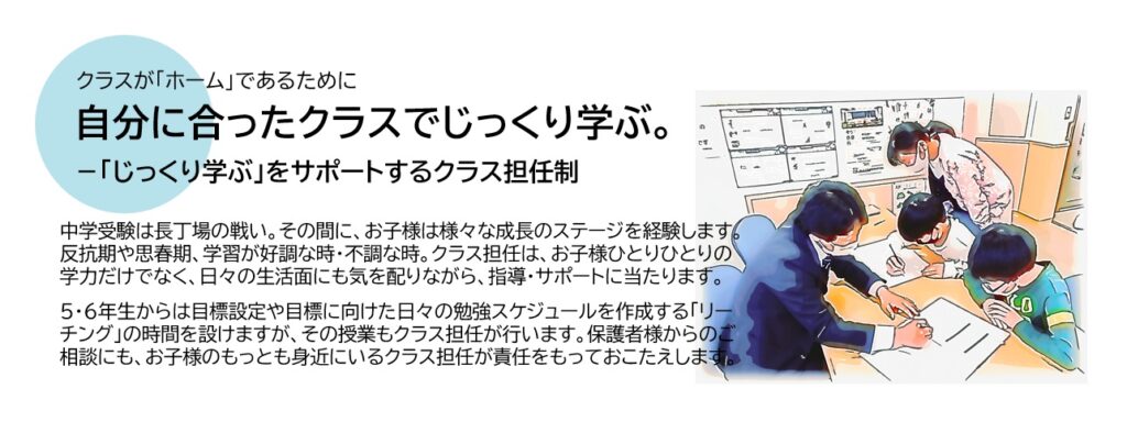 中学受験は長丁場の戦い。その間に、お子様は様々な成長のステージを経験します。反抗期や思春期、学習が好調な時・不調な時。クラス担任は、お子様ひとりひとりの学力だけでなく、ご家庭での学習状況など日々の生活面や、教科全体のバランスにも気を配りながら、指導・サポートにあたります。また、保護者様からのご相談にも、お子様のもっとも身近にいるクラス担任が責任をもっておこたえします。お子様・保護者様・クラス担任のトライアングルが、学力・精神面の充実した成長を支えます。