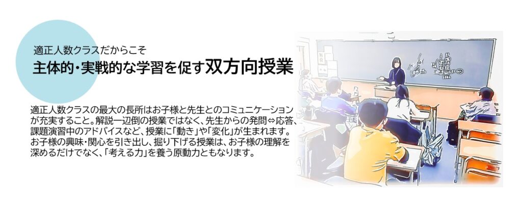 適正人数クラスの最大の長所はお子様と先生とのコミュニケーションが充実すること。解説一辺倒の授業ではなく、先生からの発問⇔応答、課題演習中のアドバイスなど、授業に「動き」や「変化」が生まれます。お子様の興味・関心を引き出し、掘り下げる授業は、お子様の理解を深めるだけでなく、「考える力」を養う原動力ともなります。