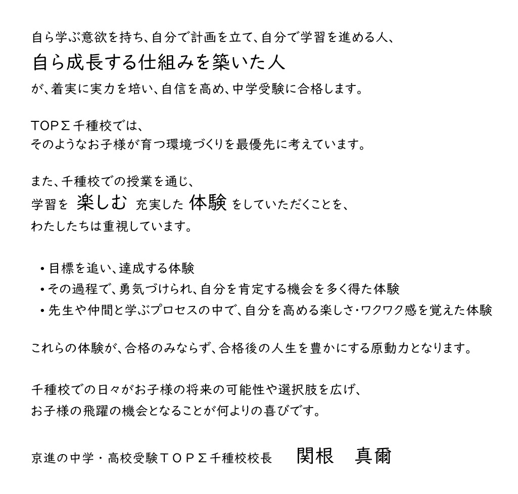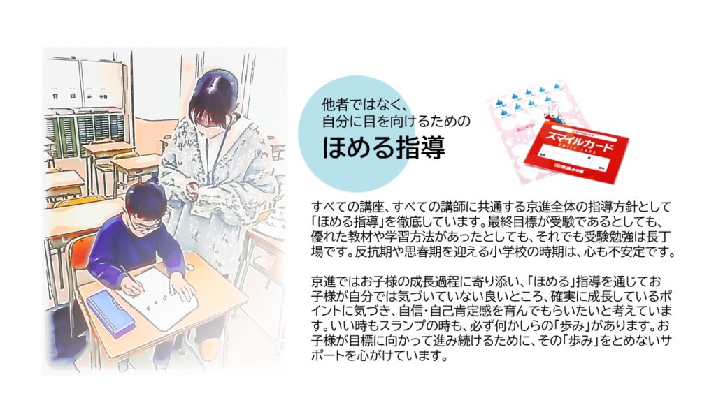 京進ではお子様の成長過程に寄り添い、「ほめる」指導を通じてお子様が自分では気づいていない良いところ、確実に成長しているポイントに気づき、自信・自己肯定感を育んでもらいたいと考えています。いい時もスランプの時も、必ず何かしらの「歩み」があります。お子様が目標に向かって進み続けるために、その「歩み」をとめないサポートを心がけています。