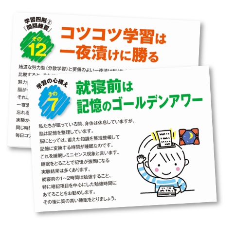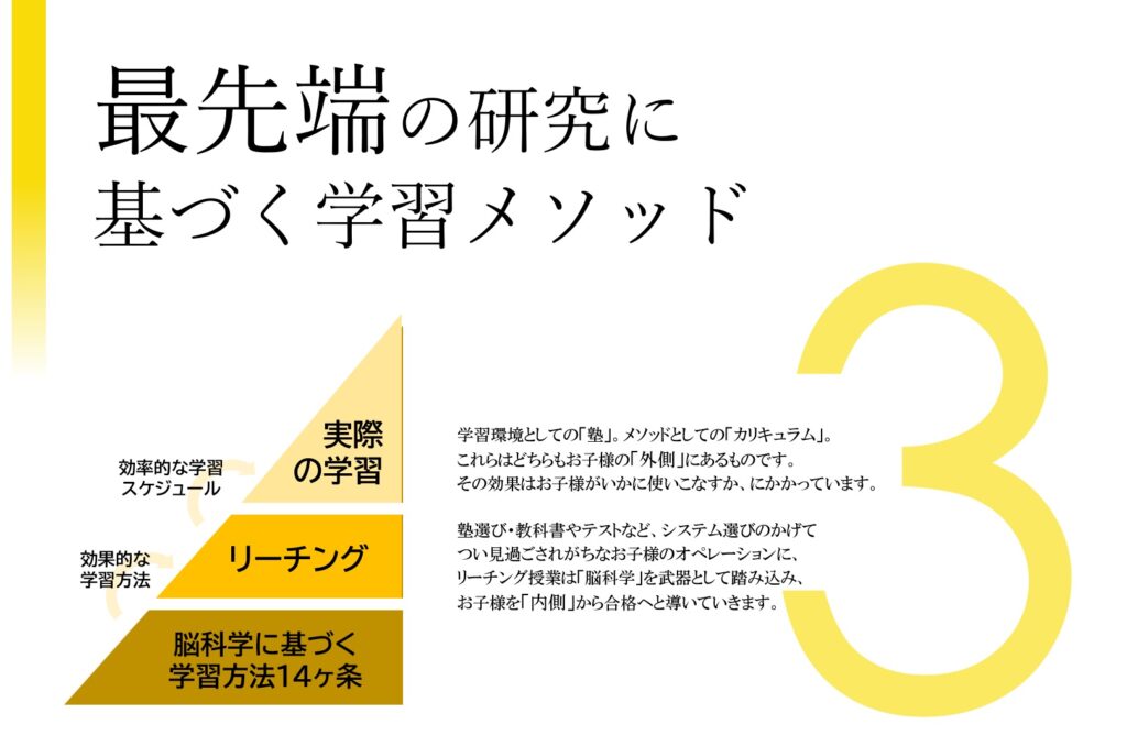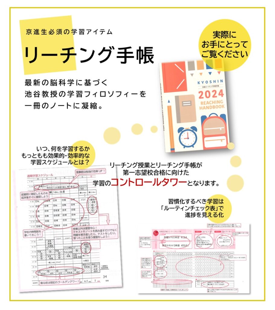 そこで、京進では効率的・効果的な勉強方法を求め、東京大学の池谷裕二教授を京進専属脳アドバイザーとして招聘し、最先端の脳科学理論や研究結果を活用した学習方法を確立。「リーチング」授業の際に、クラス全体で共有し、スケジュール作成に活かしていきます。