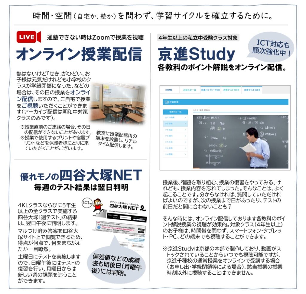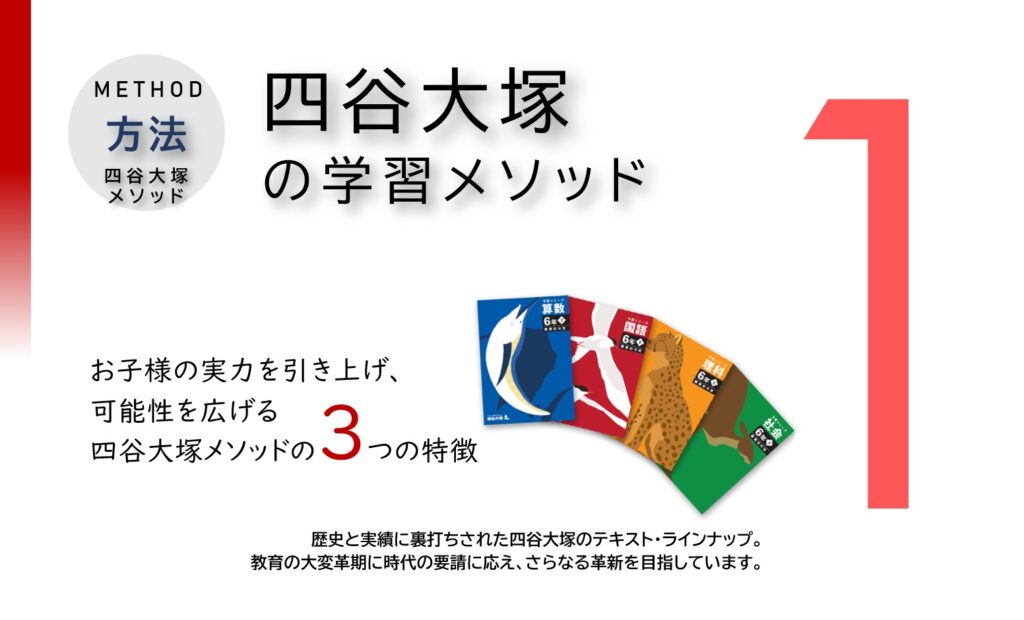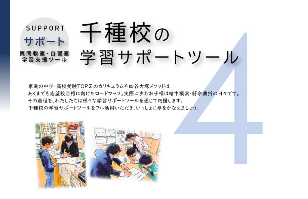京進の中学・高校受験TOPΣは関東地方の大手中学受験塾、四谷大塚と提携しております。使用する教材は、全学年・全クラス四谷大塚が発刊する「予習シリーズ」。現在、首都圏の受験生の2人に1人が使用するベストセラーであり、中学受験最高の教科書とも評されています。(四谷大塚教材PDFパンフレットより引用)