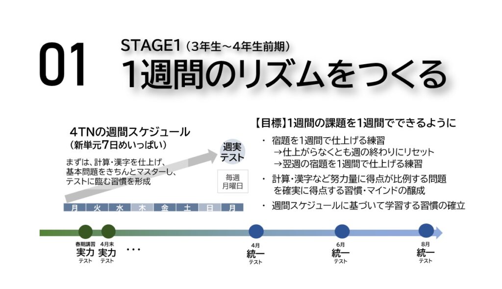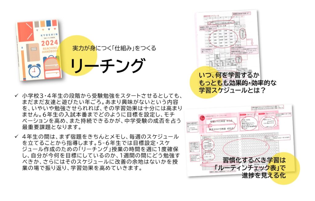 ü4年生の間は、まず宿題をきちんとメモし、毎週のスケジュールを立てることから指導します。5-6年生では目標設定・スケジュール作成のための「リーチング」授業の時間を週に1度確保し、自分が今何を目標にしているのか、1週間の間にどう勉強すべきか、さらにはそのスケジュールに改善の余地はないかを授業の場で振り返り、学習効果を高めていきます。
