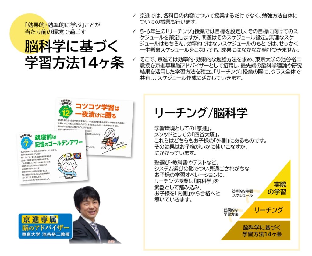 そこで、京進では効率的・効果的な勉強方法を求め、東京大学の池谷裕二教授を京進専属脳アドバイザーとして招聘し、最先端の脳科学理論や研究結果を活用した学習方法を確立。「リーチング」授業の際に、クラス全体で共有し、スケジュール作成に活かしていきます。