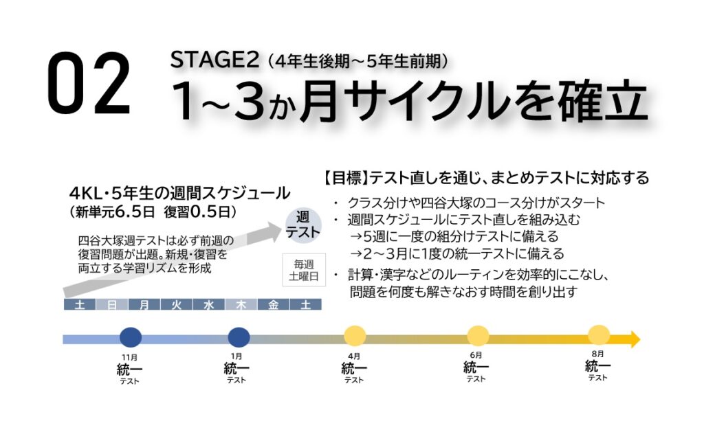 また、四谷大塚の週テストは学力に応じ、A・B・C・Sの4コースに分かれています。千種校では3クラス編成により学力別に授業を実施しておりますが、テスト段階でも学力状況に応じたをテスト問題を解くことができるため、お子様の学力アップには最適な環境となっております。