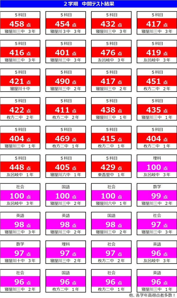- 「新中1チャレンジテスト」⇒小6対象。中学進学前に小学校内容の定着を確認します。