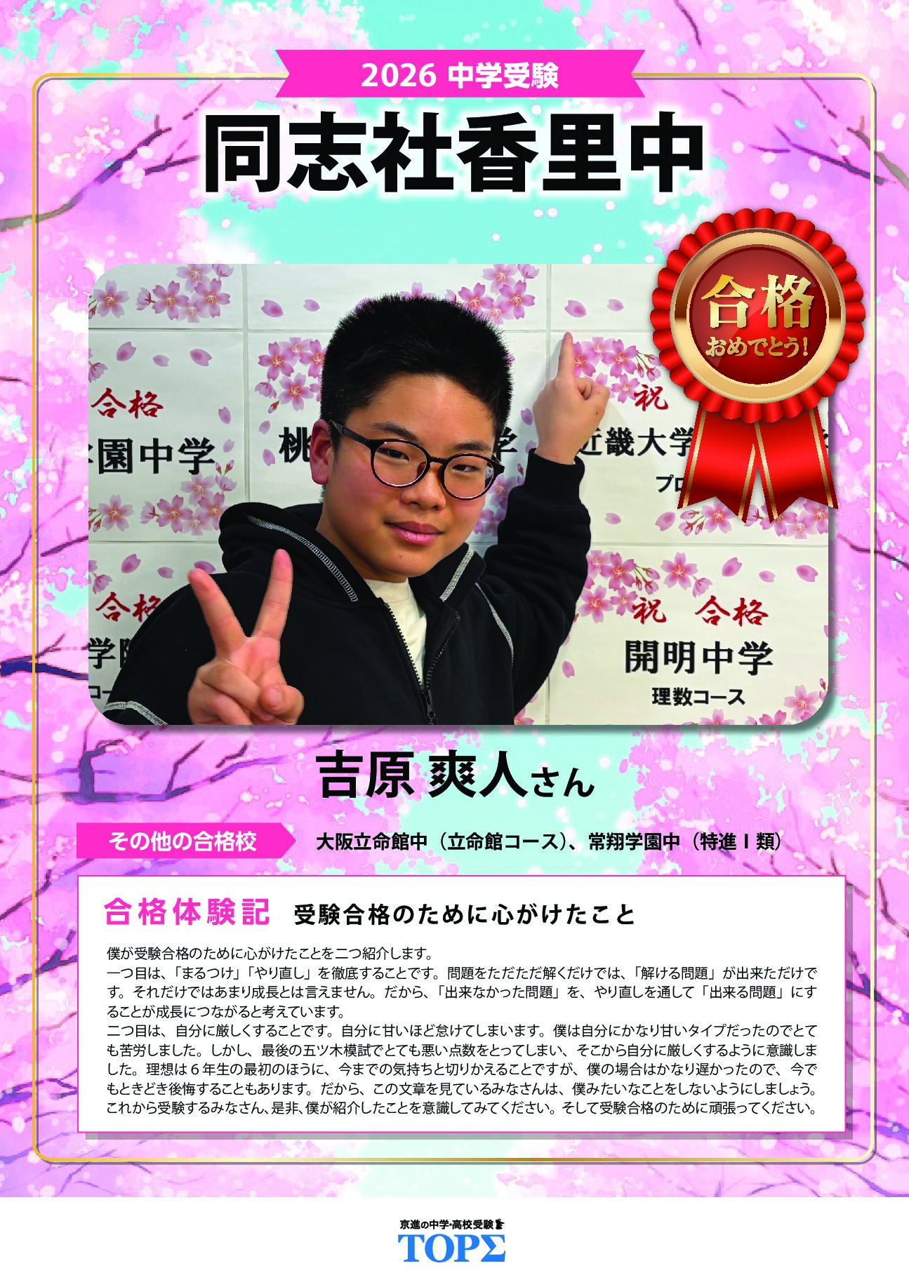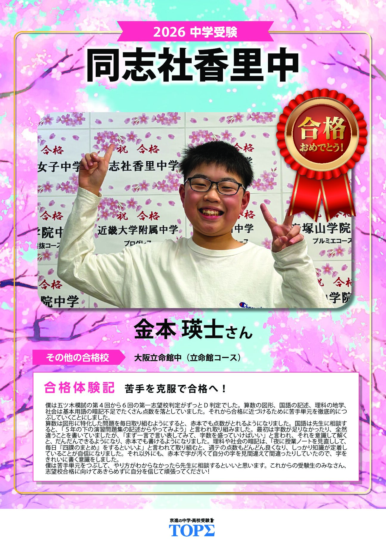 京進TOPΣでは、「19時に授業が終わる時間割設計」「授業後の算数フォロータイム(算数質問教室)」「適正人数制によるクラス定員・担任制」など、京進独自の合格メソッドで最難関・難関中はもちろん、同志社・立命館系中学に毎年たくさんの合格を輩出しています。中学受験コースは1週間に学習する内容も多く、始まりが遅れるほど負担も大きくなります。中学受験をご検討されている場合はお早めにお問合せ下さい!無料体験授業も受け付けております!下の画像リンクからは実際の校舎の様子をご覧いただけます。