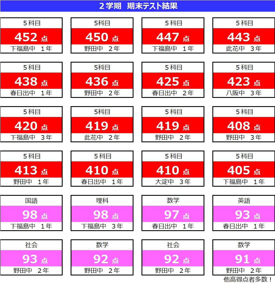 (下記は前回のテスト結果の一部です。他にも高得点、前回からの点数アップも多数!!)