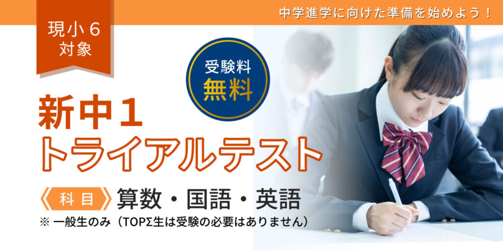 - 「新中1トライアルテスト」⇒小6対象。中学進学前に小学校内容の定着を確認します。