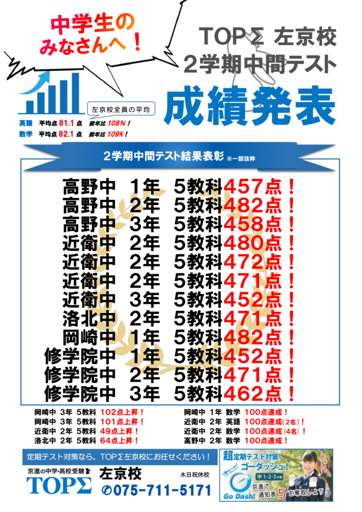 TOPΣ左京校は、左京区内の中学校のテストに強い!万全のフォロー体制でお待ちしています!
