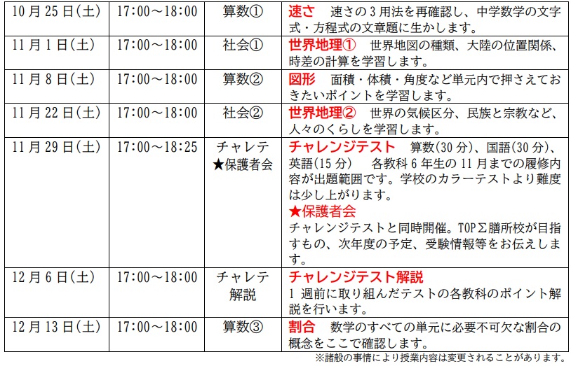 現在小学 6 年生のみなさんは、あと半年たてばいよいよ中学に進級します。中学では学期ごとに 1~2 回の定期テストがあり、その点数で通知表(≒内申)の評価が決まります。よって中学進級時から競争は始まることになります。京進の中学・高校受験 TOPΣ膳所校では、この時期の学習が中学進級時のアドバンテージになると考えられる教科・単元にしぼった講座を実施します。算数では速さ・図形・割合を学ぶことで、数学全般で活用できる考え方のコツを学びます。社会では中 1 初期で学ぶ「世界地理の基本」を理解し、スムーズなステップアップをはかります