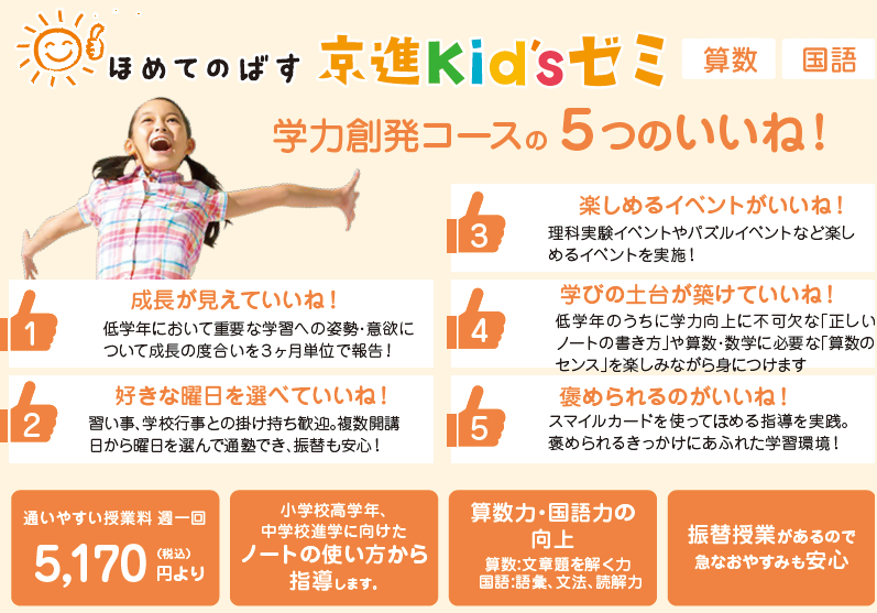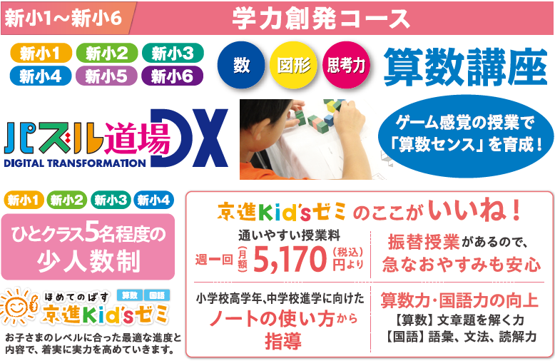 小学校低学年では「遊ぶように学ぶ」をコンセプトに、今後の学力向上に不可欠な「正しいノートの書き方」や算数・数学の土台となる「算数的センス」を楽しみながら身につけます。