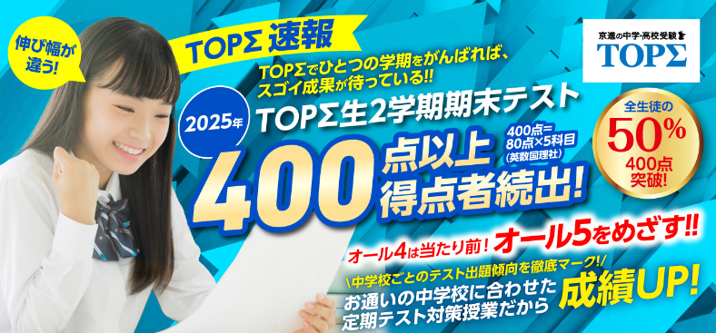 中学1年生から受験に向けた意識付け、指導を行います。受験当日の点数だけでなく、滋賀県立高校入試では「学校の内申点」も重要。そこでTOPΣでは「定期テスト対策」の授業も行います。中学2年生からは入試に向けての模試や特別特訓が少しずつスタートします。県立高だけでなく、私立専願の指導も可能です。