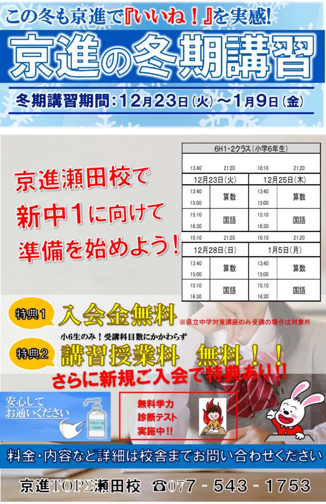 2025冬期講習 受付中|大津市|アルプラザ瀬田 4階|低学年 適正少人数指導|高校受験対策|