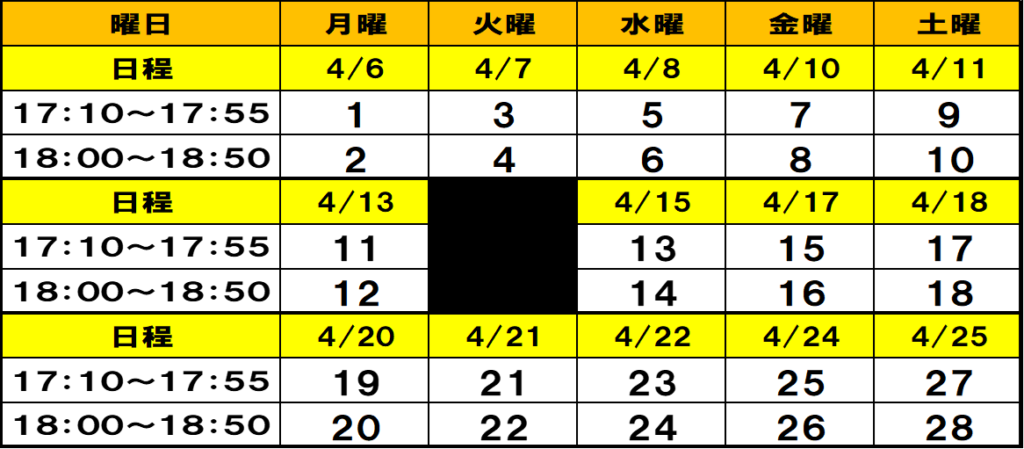| 日程 | 5/9(土) ①13:55~17:40 ②17:55~21:40 |