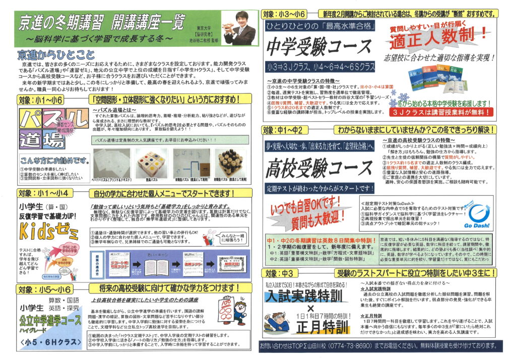 各クラスとも定員を設けており、定員に達した場合、申し込みを締め切ります。冬期講習の受講を希望される方は校舎までお電話(0774738690)していただくか、下のボタンを押してお問い合わせください。