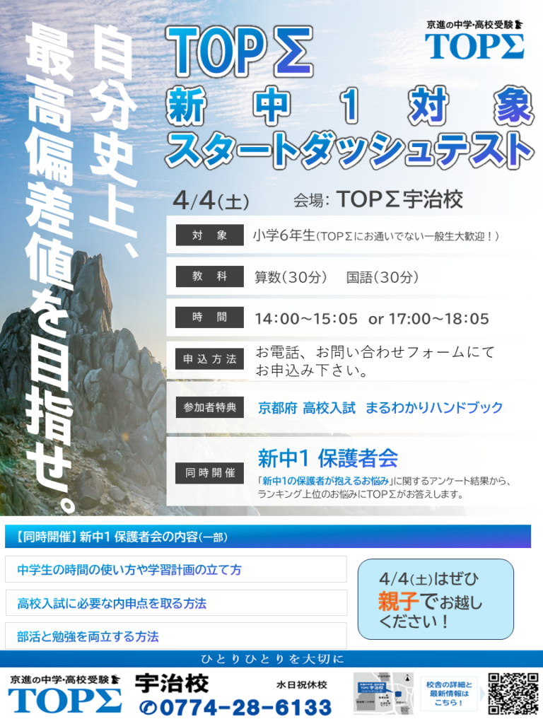 この度は、京進の中学・高校受験TOPΣ宇治校のHPをご覧いただきありがとうございます。