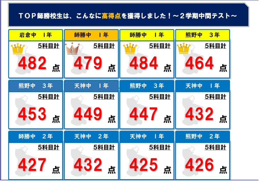2学期中間テスト結果 すごいぞ!TOPΣ師勝校生! 何と、1位は3名(^^♪