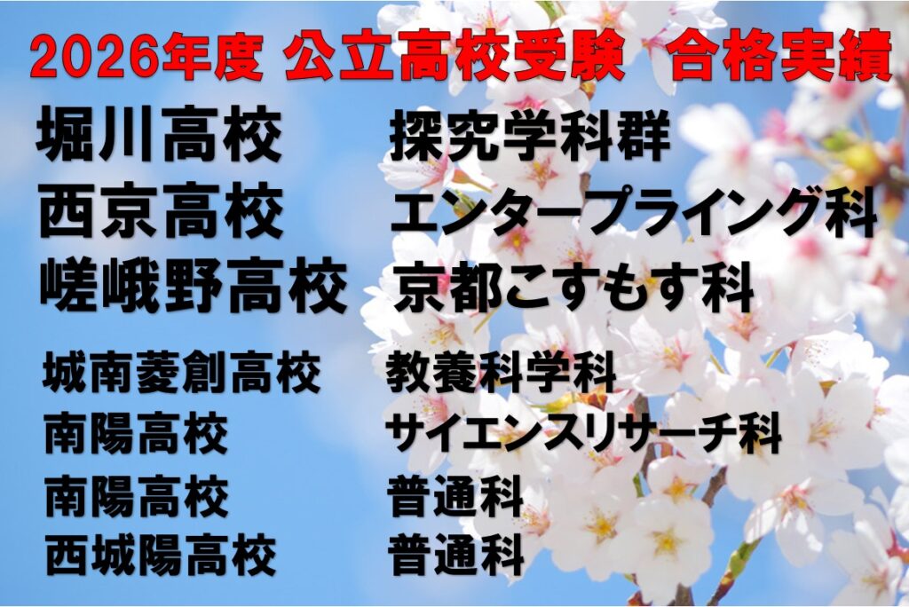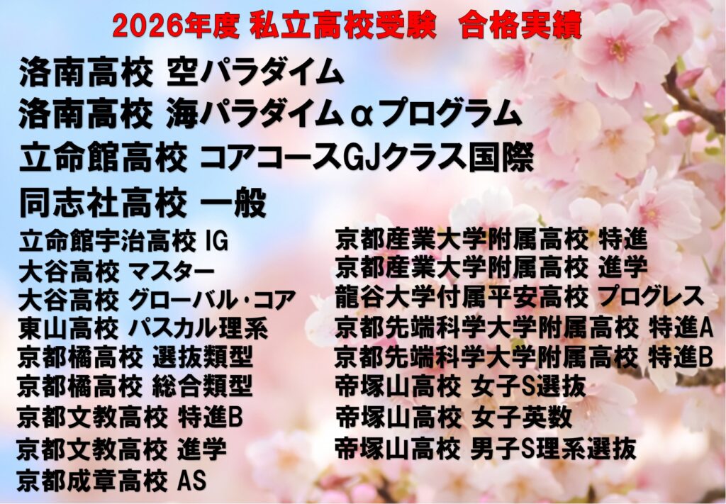 中学受験では、洛北・南陽の公立中高一貫校、同志社系列・立命館系列